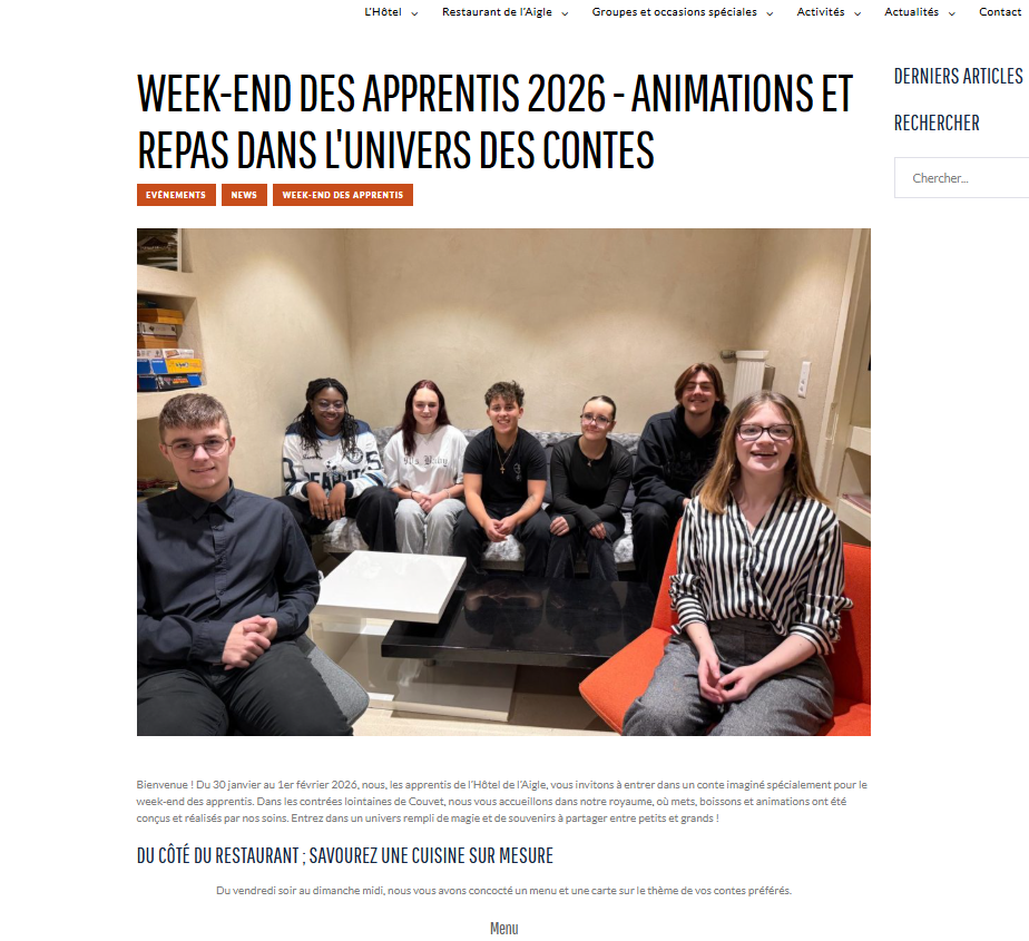 Animations et repas dans l’univers des contes Bienvenue ! Du 30 janvier au 1er février 2026, les apprentis de l’Hôtel de l’Aigle vous invitent à plonger dans un conte spécialement imaginé pour le week-end des apprentis. Dans les contrées lointaines de Couvet, ils vous accueillent dans leur royaume, où mets, boissons et animations ont été […]